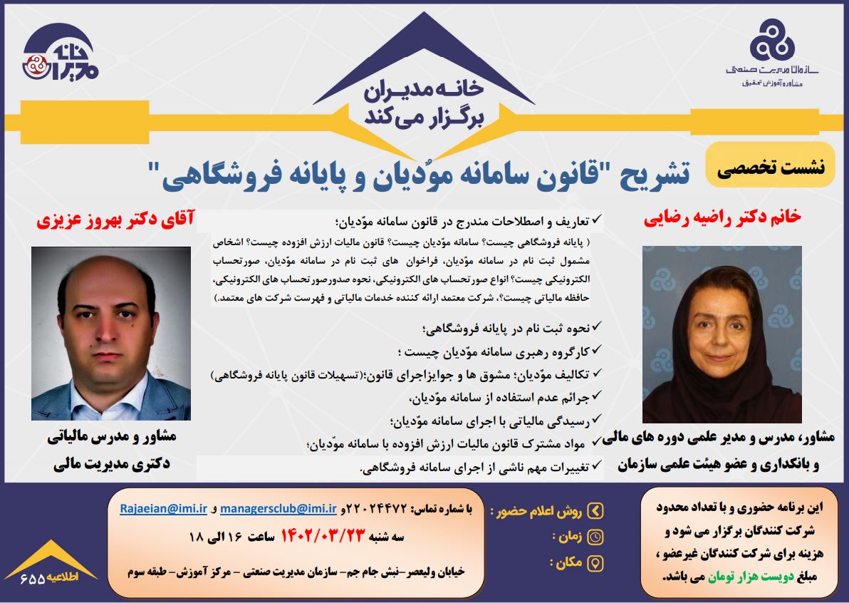 میهمانان این نشست تخصصی سرکارخانم دکتر رضایی عضو هیئت علمی سازمان مدیریت صنعتی و آقای دکتر بهروز عزیزی مشاور و مدرس مالیاتی